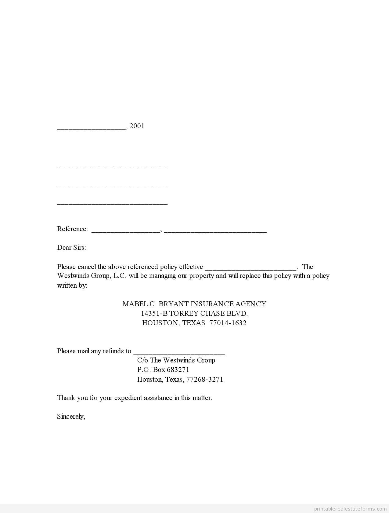 Please cancel the above referenced policy effective ________________________. The Westwinds Group, L.C. will be managing our property and will replace this policy with a policy written by: