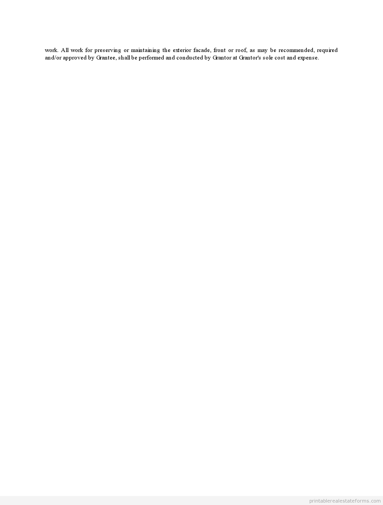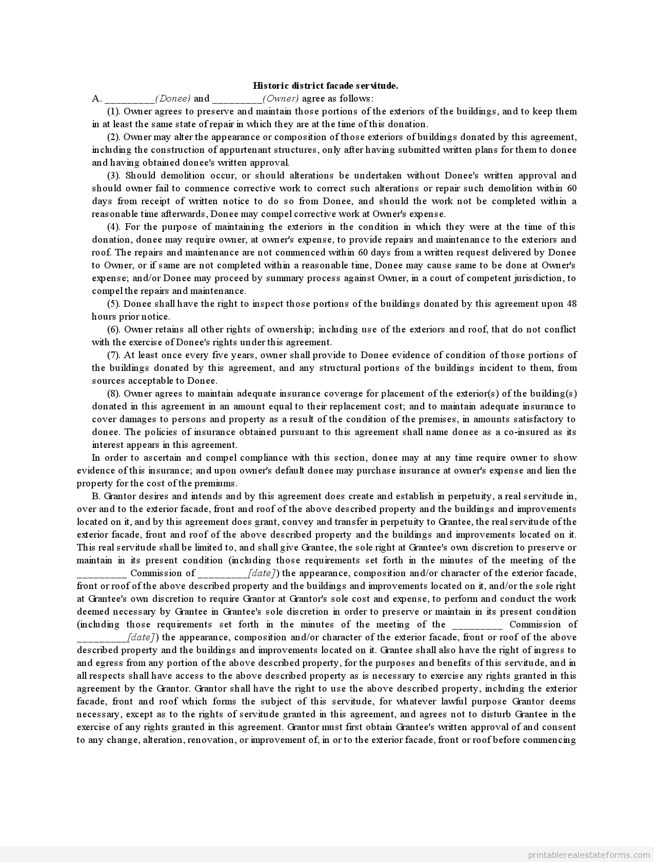 B. Grantor desires and intends and by this agreement does create and establish in perpetuity, a real servitude in, over and to the exterior facade, front and roof of the above described property and the buildings and improvements located on it, and by this agreement does grant, convey and transfer in perpetuity to Grantee, the real servitude of the exterior facade, front and roof of the above described property and the buildings and improvements located on it. This real servitude shall be limited to, and shall give Grantee, the sole right at Grantee’s own discretion to preserve or maintain in its present condition (including those requirements set forth in the minutes of the meeting of the _________ Commission of _________[date]) the appearance, composition and/or character of the exterior facade, front or roof of the above described property and the buildings and improvements located on it, and/or the sole right at Grantee’s own discretion to require Grantor at Grantor’s sole cost and expense, to perform and conduct the work deemed necessary by Grantee in Grantee’s sole discretion in order to preserve or maintain in its present condition (including those requirements set forth in the minutes of the meeting of the _________ Commission of _________[date]) the appearance, composition and/or character of the exterior facade, front or roof of the above described property and the buildings and improvements located on it. Grantee shall also have the right of ingress to and egress from any portion of the above described property, for the purposes and benefits of this servitude, and in all respects shall have access to the above described property as is necessary to exercise any rights granted in this agreement by the Grantor. Grantor shall have the right to use the above described property, including the exterior facade, front and roof which forms the subject of this servitude, for whatever lawful purpose Grantor deems necessary, except as to the rights of servitude granted in this agreement, and agrees not to disturb Grantee in the exercise of any rights granted in this agreement. Grantor must first obtain Grantee’s written approval of and consent to any change, alteration, renovation, or improvement of, in or to the exterior facade, front or roof before commencing work. All work for preserving or maintaining the exterior facade, front or roof, as may be recommended, required and/or approved by Grantee, shall be performed and conducted by Grantor at Grantor’s sole cost and expense.