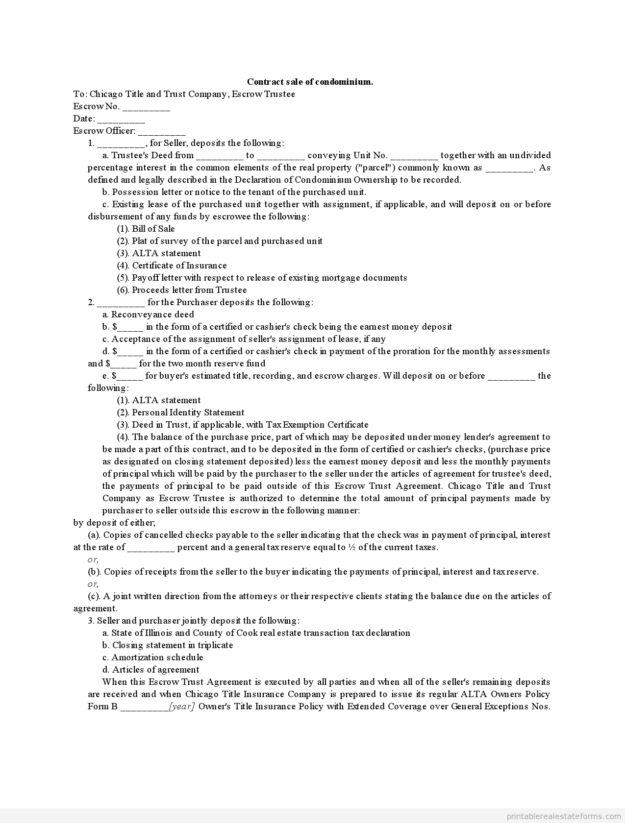 When this Escrow Trust Agreement is executed by all parties and when all of the seller’s remaining deposits are received and when Chicago Title Insurance Company is prepared to issue its regular ALTA Owners Policy Form B _________[year] Owner’s Title Insurance Policy with Extended Coverage over General Exceptions Nos. 1–5 in the amount of purchase price subject to the usual terms, conditions and exceptions contained in the policy, insuring title of grantor in the Trustee’s Deed, subject to the following:
