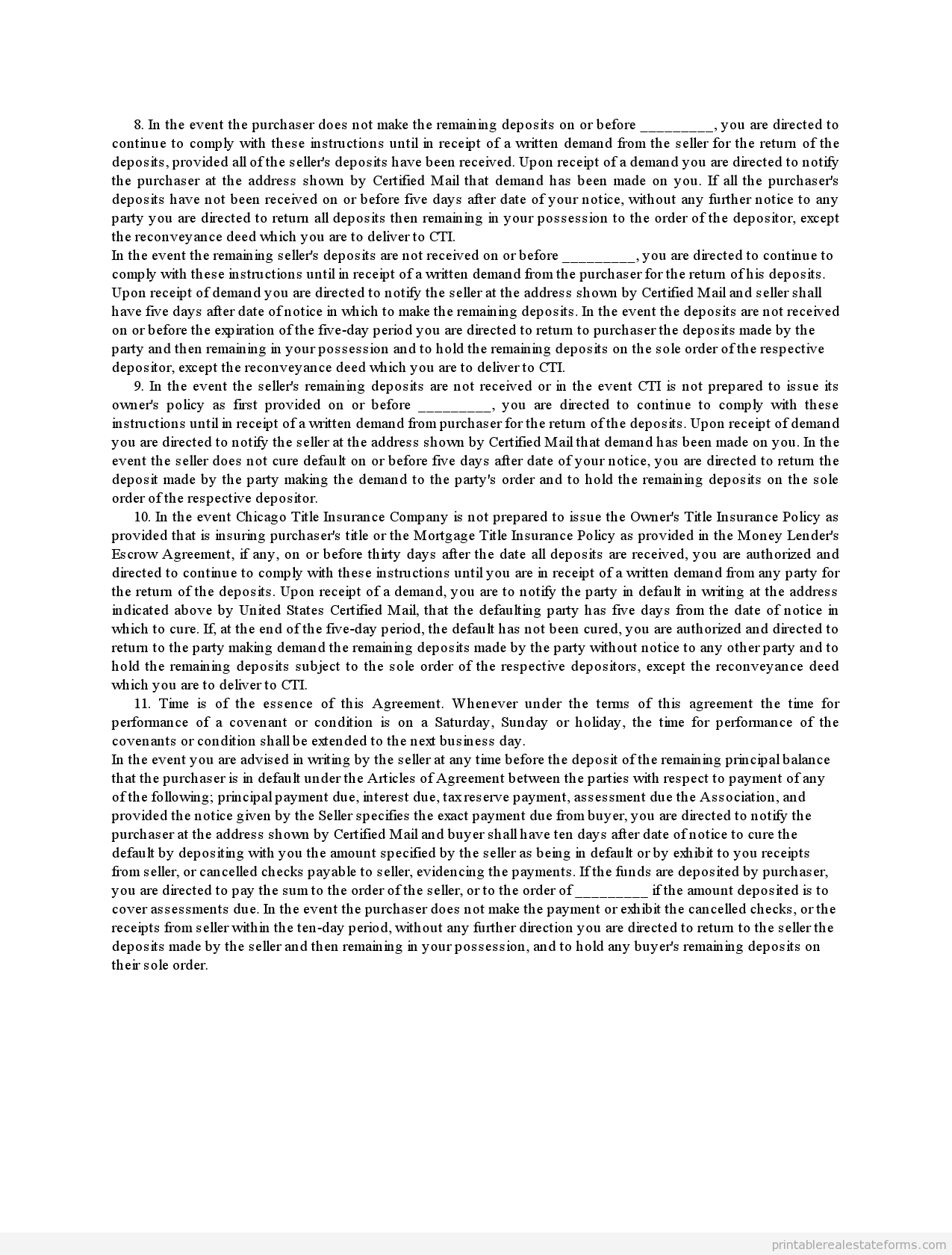 8. In the event the purchaser does not make the remaining deposits on or before _________, you are directed to continue to comply with these instructions until in receipt of a written demand from the seller for the return of the deposits, provided all of the seller’s deposits have been received. Upon receipt of a demand you are directed to notify the purchaser at the address shown by Certified Mail that demand has been made on you. If all the purchaser’s deposits have not been received on or before five days after date of your notice, without any further notice to any party you are directed to return all deposits then remaining in your possession to the order of the depositor, except the reconveyance deed which you are to deliver to CTI.