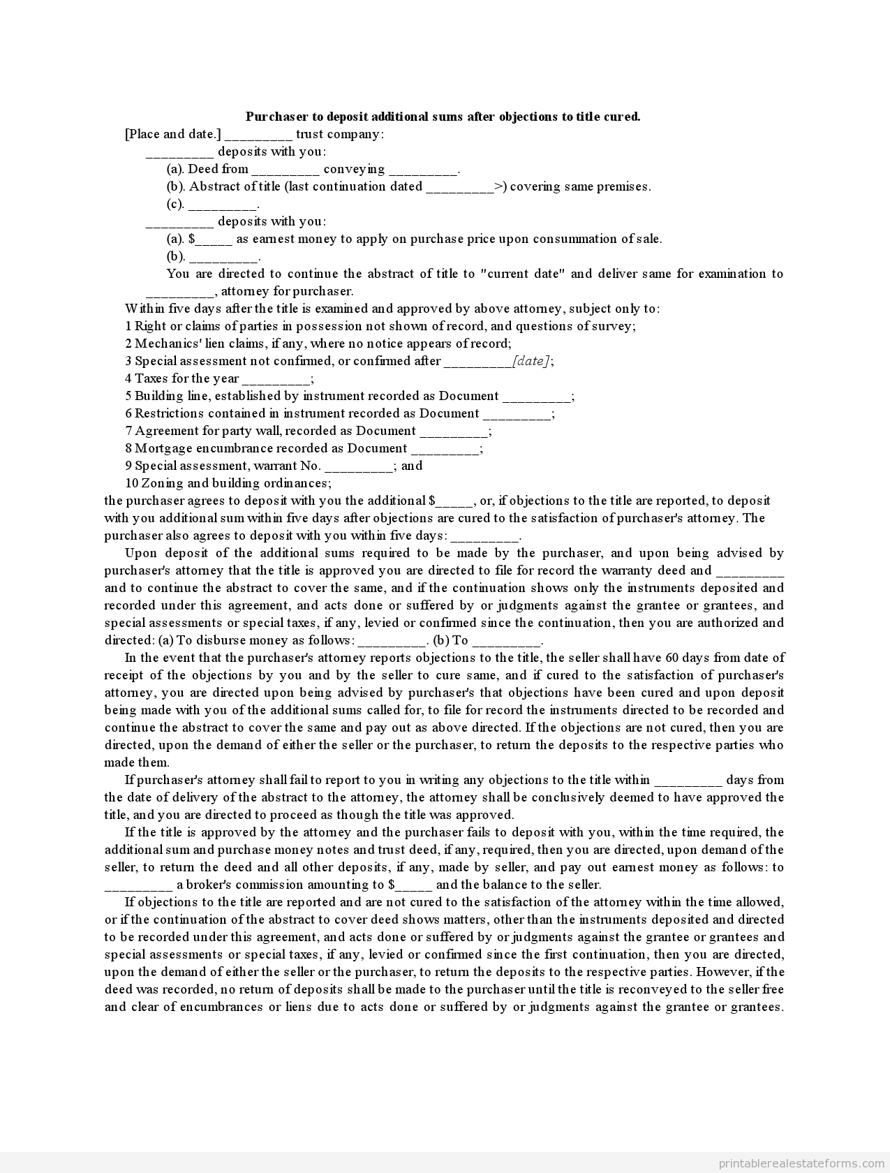 the purchaser agrees to deposit with you the additional $_____, or, if objections to the title are reported, to deposit with you additional sum within five days after objections are cured to the satisfaction of purchaser’s attorney. The purchaser also agrees to deposit with you within five days: _________.