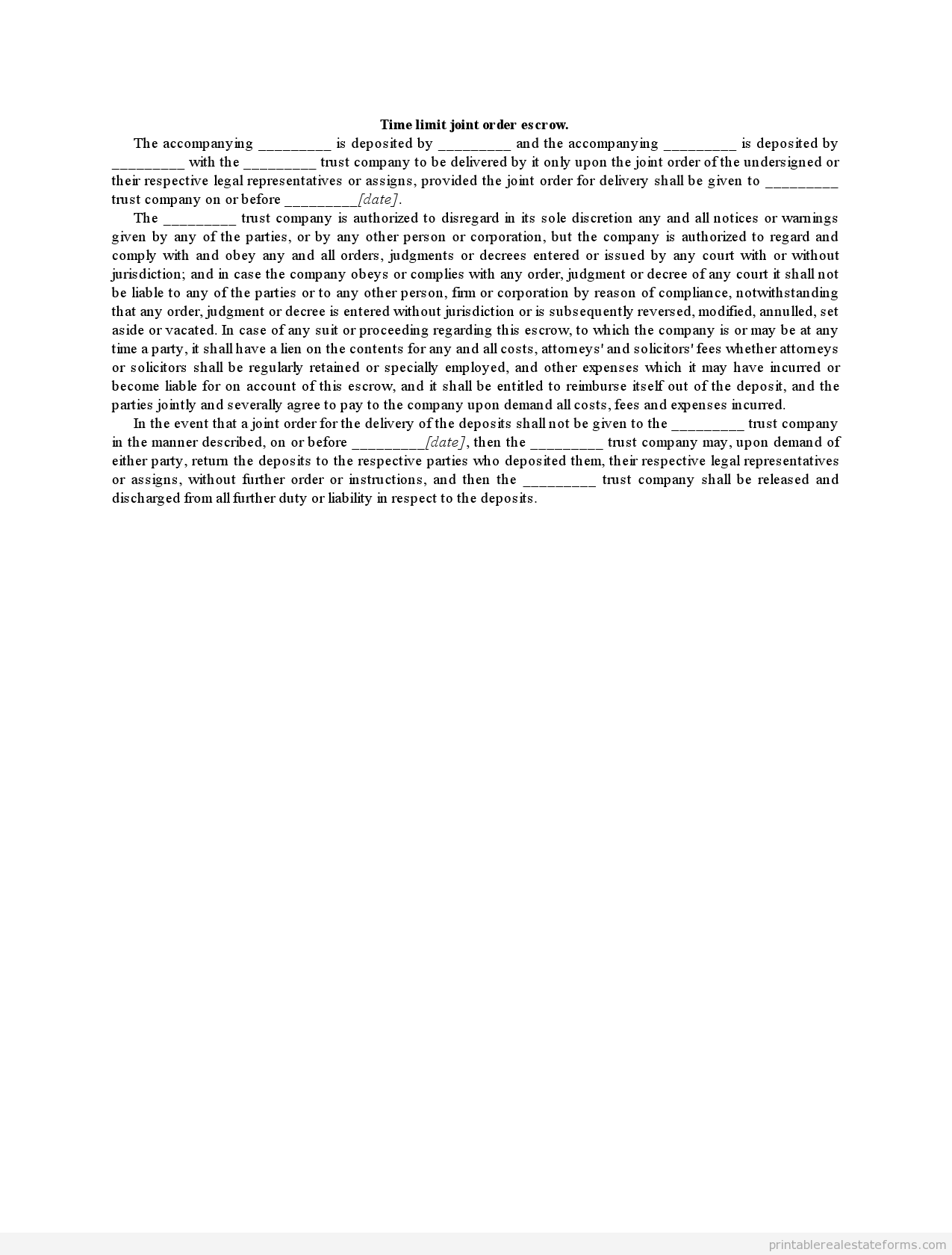 The accompanying _________ is deposited by _________ and the accompanying _________ is deposited by _________ with the _________ trust company to be delivered by it only upon the joint order of the undersigned or their respective legal representatives or assigns, provided the joint order for delivery shall be given to _________ trust company on or before _________[date].