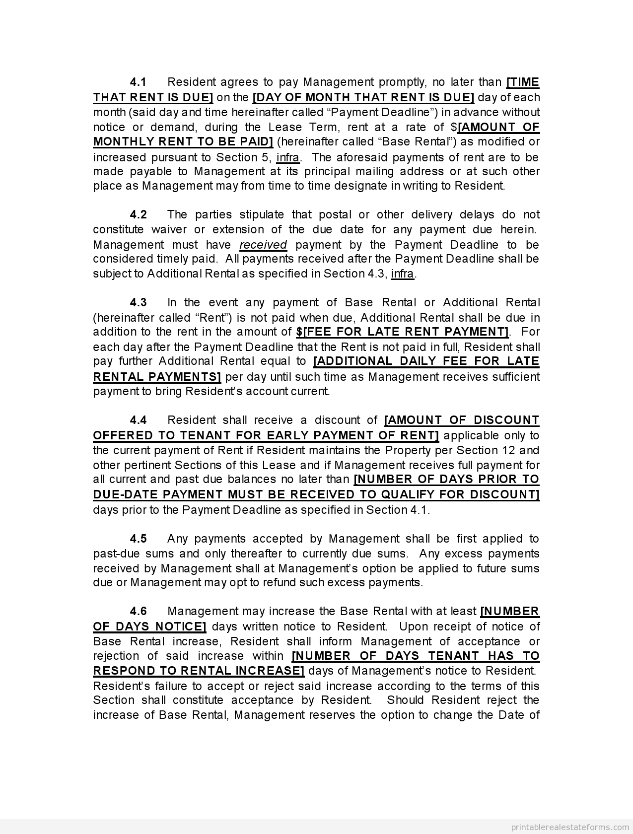 4.1 Resident agrees to pay Management promptly, no later than [TIME THAT RENT IS DUE] on the [DAY OF MONTH THAT RENT IS DUE] day of each month (said day and time hereinafter called “Payment Deadline”) in advance without notice or demand, during the Lease Term, rent at a rate of $[AMOUNT OF MONTHLY RENT TO BE PAID] (hereinafter called “Base Rental”) as modified or increased pursuant to Section 5, infra. The aforesaid payments of rent are to be made payable to Management at its principal mailing address or at such other place as Management may from time to time designate in writing to Resident.