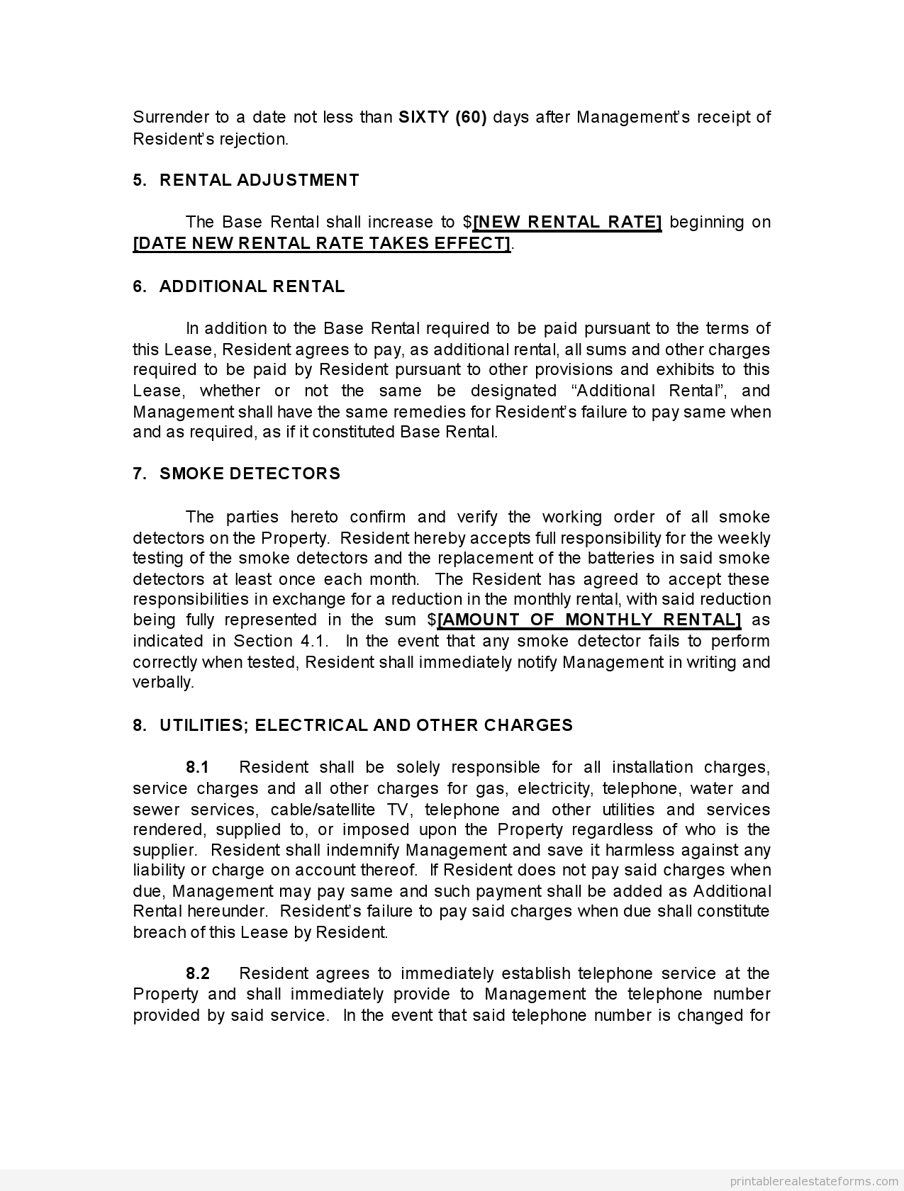 4.6 Management may increase the Base Rental with at least [NUMBER OF DAYS NOTICE] days written notice to Resident. Upon receipt of notice of Base Rental increase, Resident shall inform Management of acceptance or rejection of said increase within [NUMBER OF DAYS TENANT HAS TO RESPOND TO RENTAL INCREASE] days of Management’s notice to Resident. Resident’s failure to accept or reject said increase according to the terms of this Section shall constitute acceptance by Resident. Should Resident reject the increase of Base Rental, Management reserves the option to change the Date of Surrender to a date not less than SIXTY (60) days after Management’s receipt of Resident’s rejection.