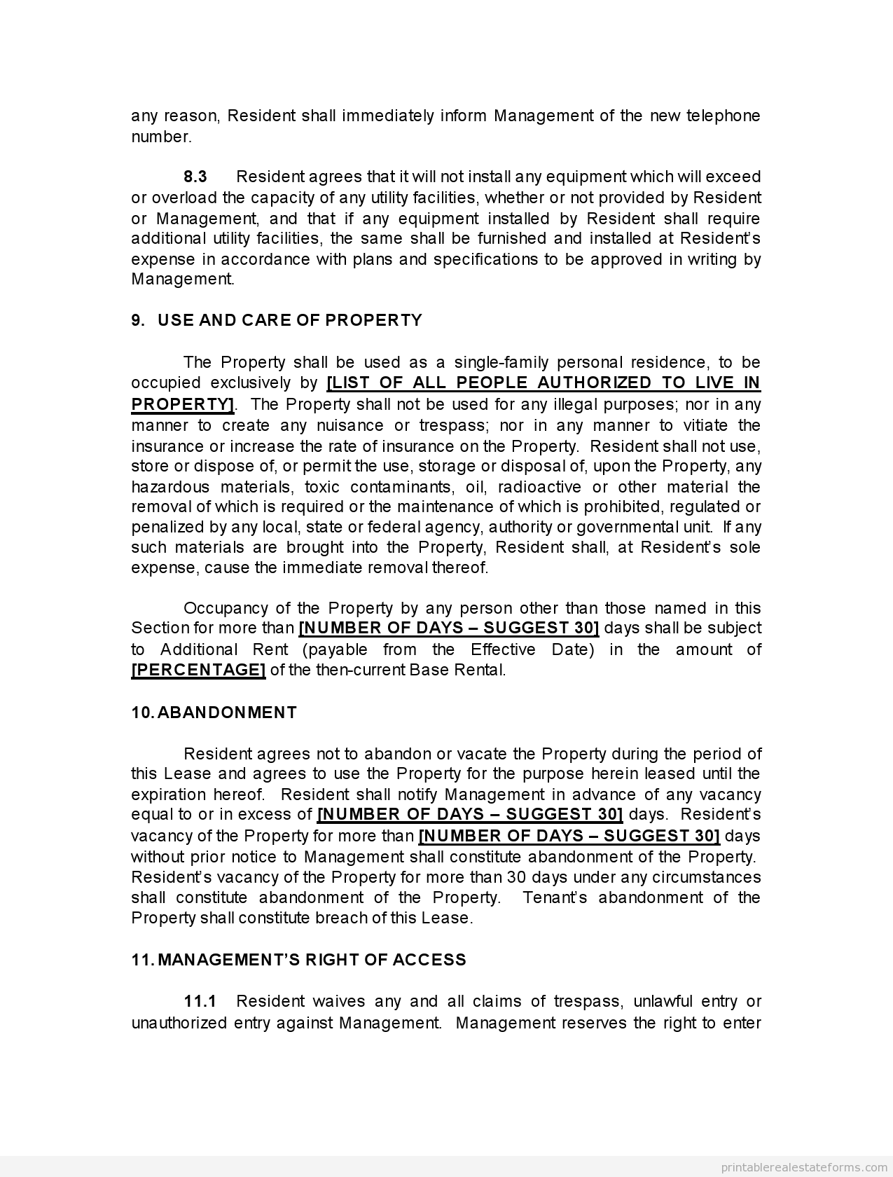 Resident agrees not to abandon or vacate the Property during the period of this Lease and agrees to use the Property for the purpose herein leased until the expiration hereof. Resident shall notify Management in advance of any vacancy equal to or in excess of [NUMBER OF DAYS – SUGGEST 30] days. Resident’s vacancy of the Property for more than [NUMBER OF DAYS – SUGGEST 30] days without prior notice to Management shall constitute abandonment of the Property. Resident’s vacancy of the Property for more than 30 days under any circumstances shall constitute abandonment of the Property. Tenant’s abandonment of the Property shall constitute breach of this Lease.