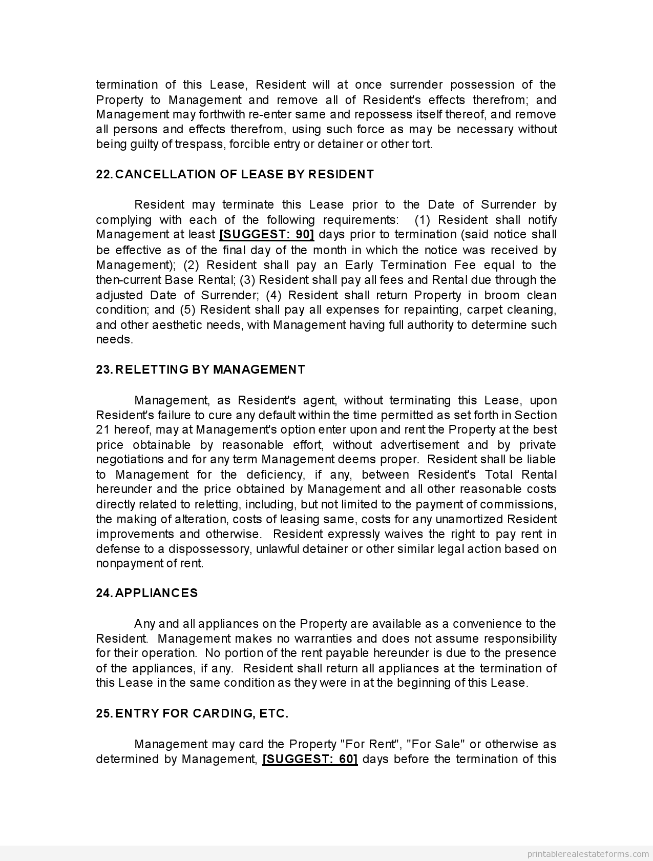 Resident may terminate this Lease prior to the Date of Surrender by complying with each of the following requirements: (1) Resident shall notify Management at least [SUGGEST: 90] days prior to termination (said notice shall be effective as of the final day of the month in which the notice was received by Management); (2) Resident shall pay an Early Termination Fee equal to the then-current Base Rental; (3) Resident shall pay all fees and Rental due through the adjusted Date of Surrender; (4) Resident shall return Property in broom clean condition; and (5) Resident shall pay all expenses for repainting, carpet cleaning, and other aesthetic needs, with Management having full authority to determine such needs.