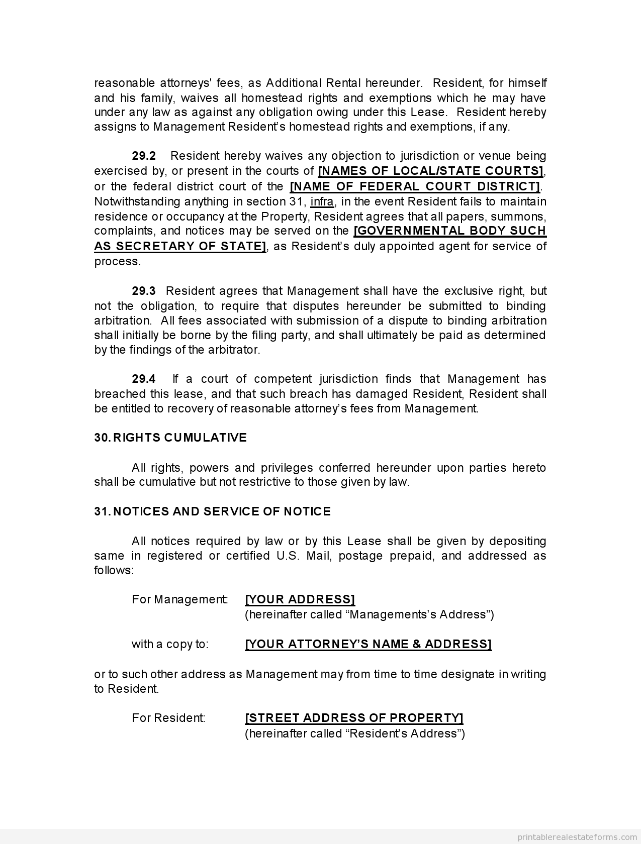 29.2 Resident hereby waives any objection to jurisdiction or venue being exercised by, or present in the courts of [NAMES OF LOCAL/STATE COURTS], or the federal district court of the [NAME OF FEDERAL COURT DISTRICT]. Notwithstanding anything in section 31, infra, in the event Resident fails to maintain residence or occupancy at the Property, Resident agrees that all papers, summons, complaints, and notices may be served on the [GOVERNMENTAL BODY SUCH AS SECRETARY OF STATE], as Resident’s duly appointed agent for service of process.