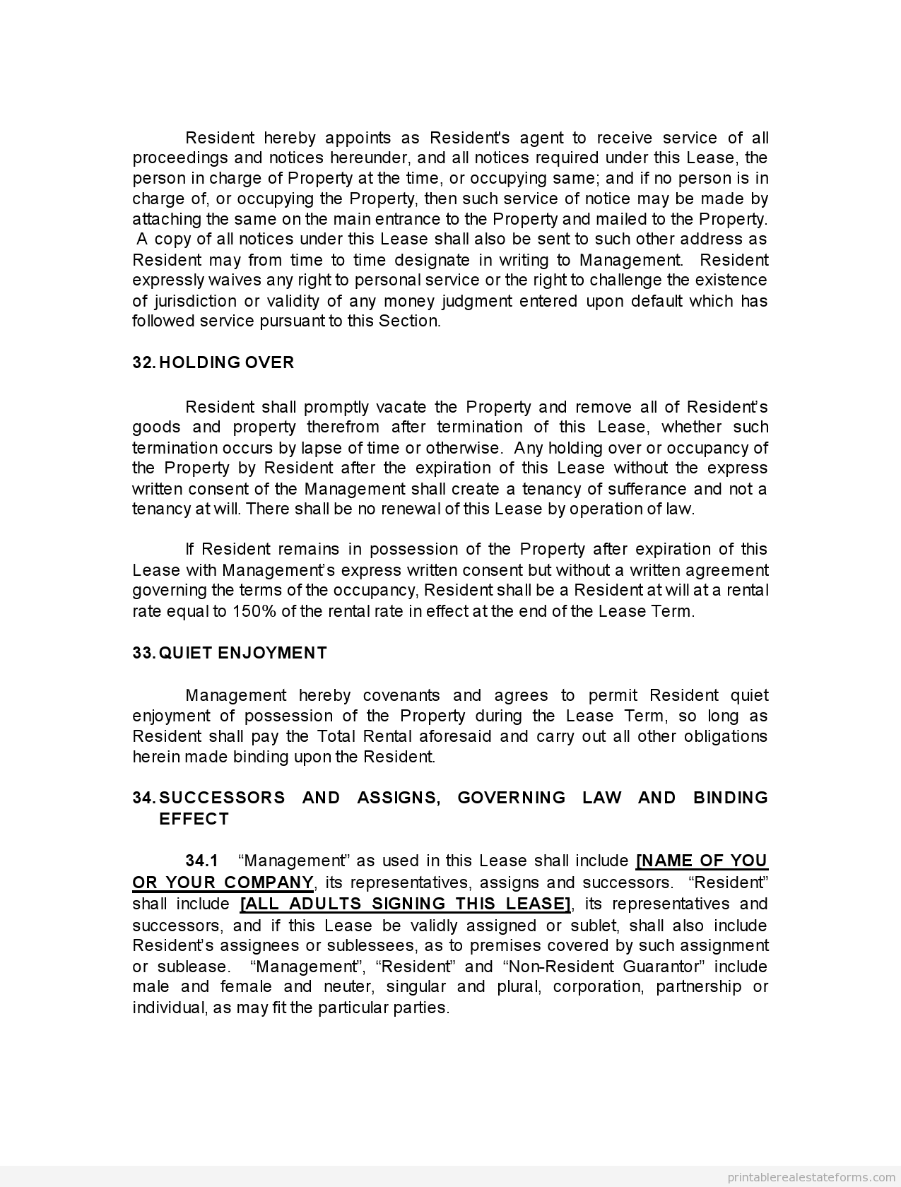 34.1 “Management” as used in this Lease shall include [NAME OF YOU OR YOUR COMPANY, its representatives, assigns and successors. “Resident” shall include [ALL ADULTS SIGNING THIS LEASE], its representatives and successors, and if this Lease be validly assigned or sublet, shall also include Resident’s assignees or sublessees, as to premises covered by such assignment or sublease. “Management”, “Resident” and “Non-Resident Guarantor” include male and female and neuter, singular and plural, corporation, partnership or individual, as may fit the particular parties.