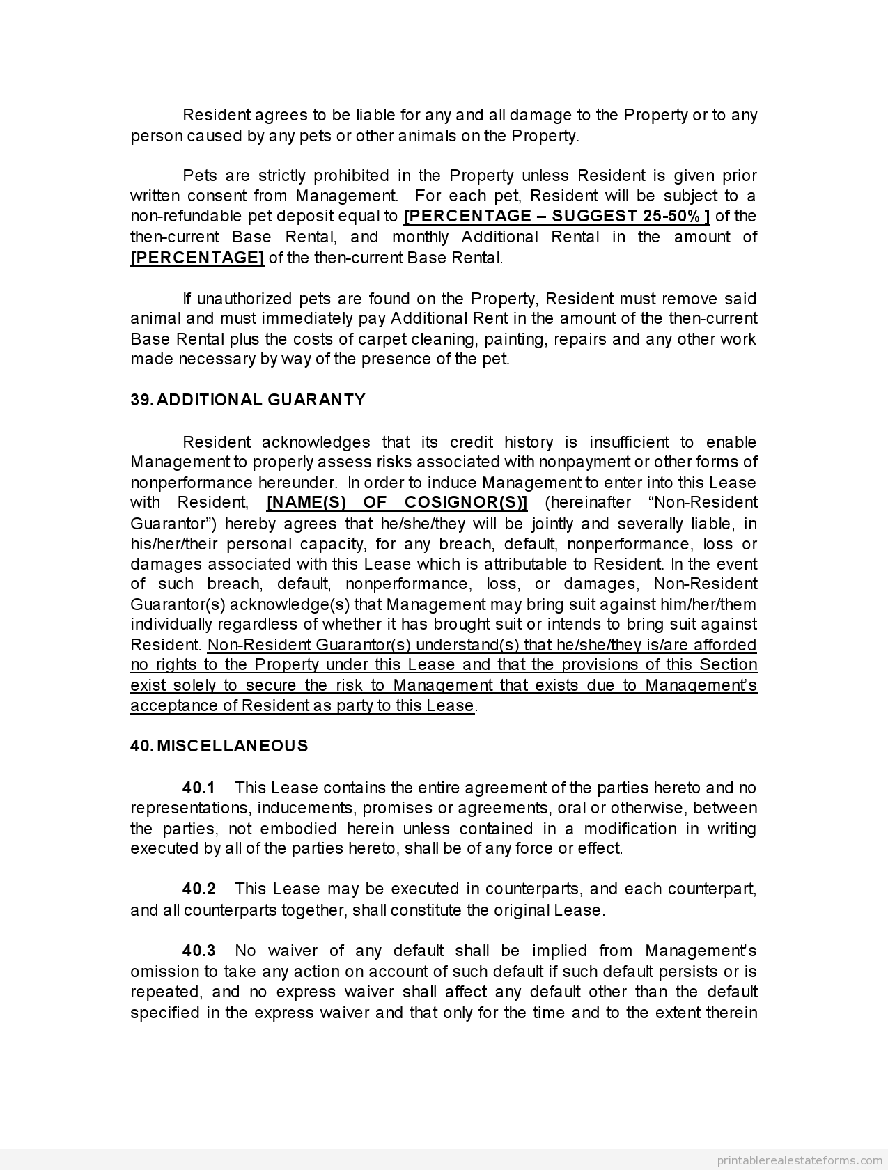 Resident acknowledges that its credit history is insufficient to enable Management to properly assess risks associated with nonpayment or other forms of nonperformance hereunder. In order to induce Management to enter into this Lease with Resident, [NAME(S) OF COSIGNOR(S)] (hereinafter “Non-Resident Guarantor”) hereby agrees that he/she/they will be jointly and severally liable, in his/her/their personal capacity, for any breach, default, nonperformance, loss or damages associated with this Lease which is attributable to Resident. In the event of such breach, default, nonperformance, loss, or damages, Non-Resident Guarantor(s) acknowledge(s) that Management may bring suit against him/her/them individually regardless of whether it has brought suit or intends to bring suit against Resident. Non-Resident Guarantor(s) understand(s) that he/she/they is/are afforded no rights to the Property under this Lease and that the provisions of this Section exist solely to secure the risk to Management that exists due to Management’s acceptance of Resident as party to this Lease.