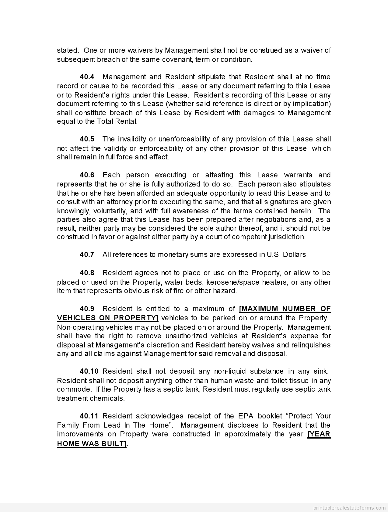 40.11 Resident acknowledges receipt of the EPA booklet “Protect Your Family From Lead In The Home”. Management discloses to Resident that the improvements on Property were constructed in approximately the year [YEAR HOME WAS BUILT].