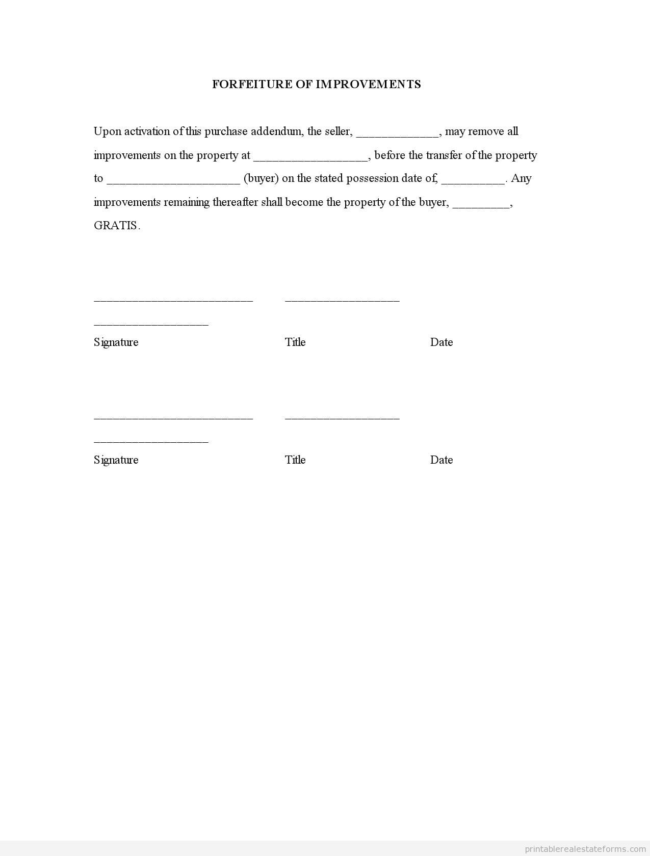 Upon activation of this purchase addendum, the seller, _____________, may remove all improvements on the property at __________________, before the transfer of the property to _____________________ (buyer) on the stated possession date of, __________. Any improvements remaining thereafter shall become the property of the buyer, _________, GRATIS.