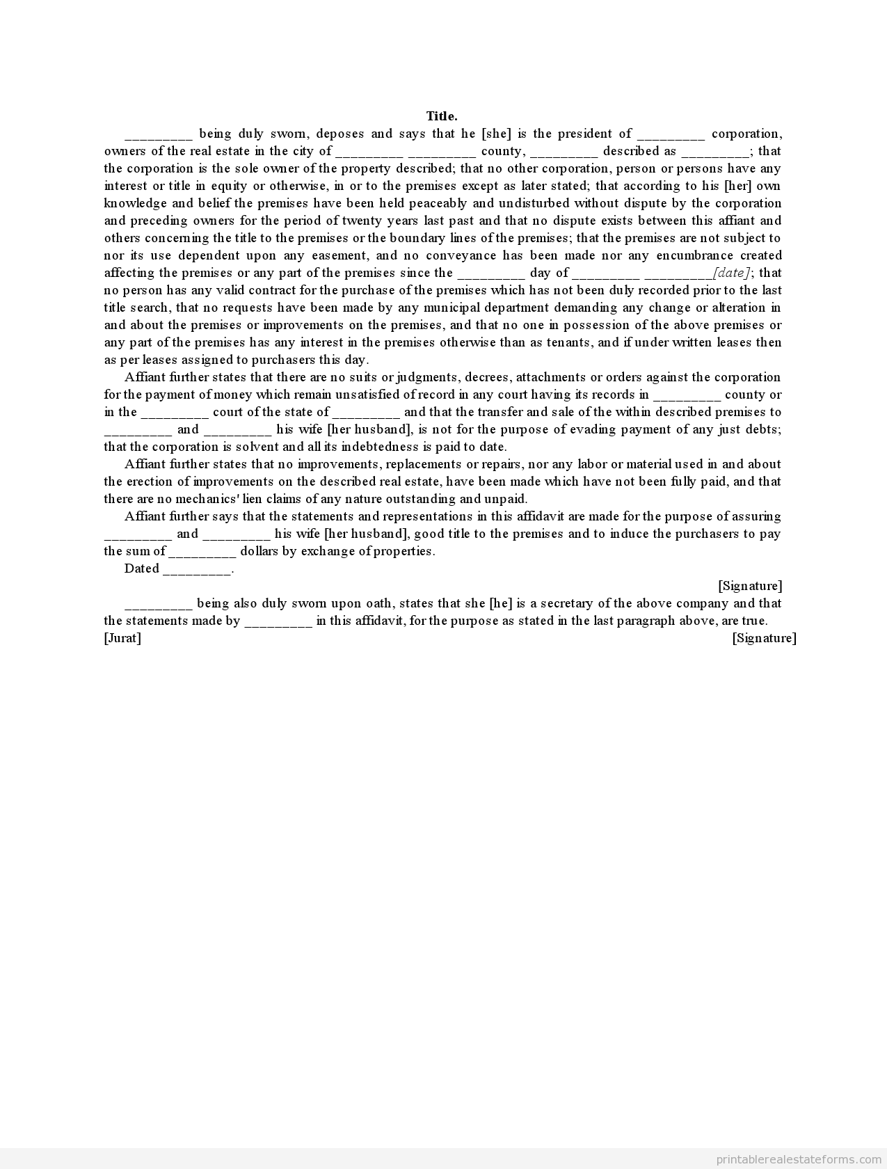 _________ being duly sworn, deposes and says that he [she] is the president of _________ corporation, owners of the real estate in the city of _________ _________ county, _________ described as _________; that the corporation is the sole owner of the property described; that no other corporation, person or persons have any interest or title in equity or otherwise, in or to the premises except as later stated; that according to his [her] own knowledge and belief the premises have been held peaceably and undisturbed without dispute by the corporation and preceding owners for the period of twenty years last past and that no dispute exists between this affiant and others concerning the title to the premises or the boundary lines of the premises; that the premises are not subject to nor its use dependent upon any easement, and no conveyance has been made nor any encumbrance created affecting the premises or any part of the premises since the _________ day of _________ _________[date]; that no person has any valid contract for the purchase of the premises which has not been duly recorded prior to the last title search, that no requests have been made by any municipal department demanding any change or alteration in and about the premises or improvements on the premises, and that no one in possession of the above premises or any part of the premises has any interest in the premises otherwise than as tenants, and if under written leases then as per leases assigned to purchasers this day.