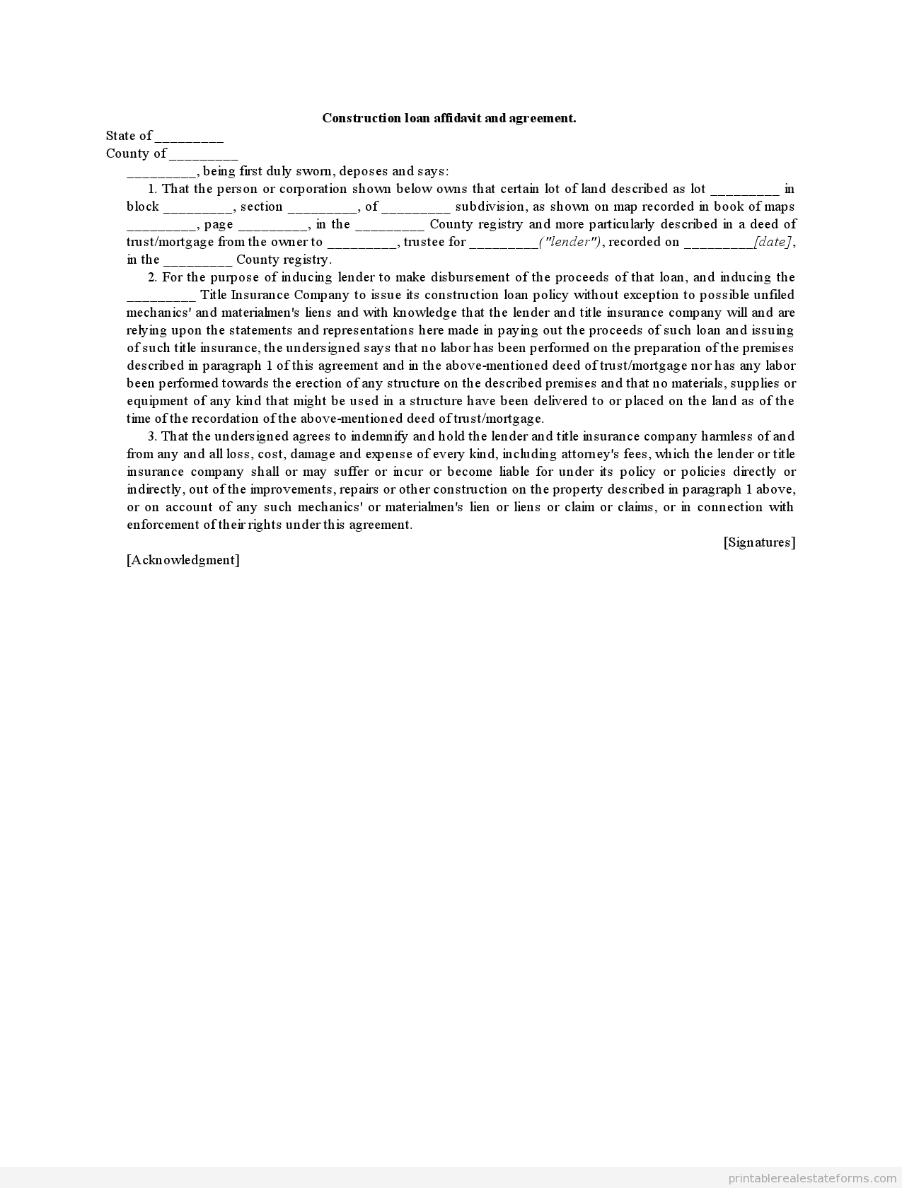 There are three people who need to sign the construction loan affidavit and agreement. They are the owner of the land or the construction site, the contractor who is going to carry out the work of construction n the property as well as the notary public in whose presence the formerly mentioned people need to sign the document.